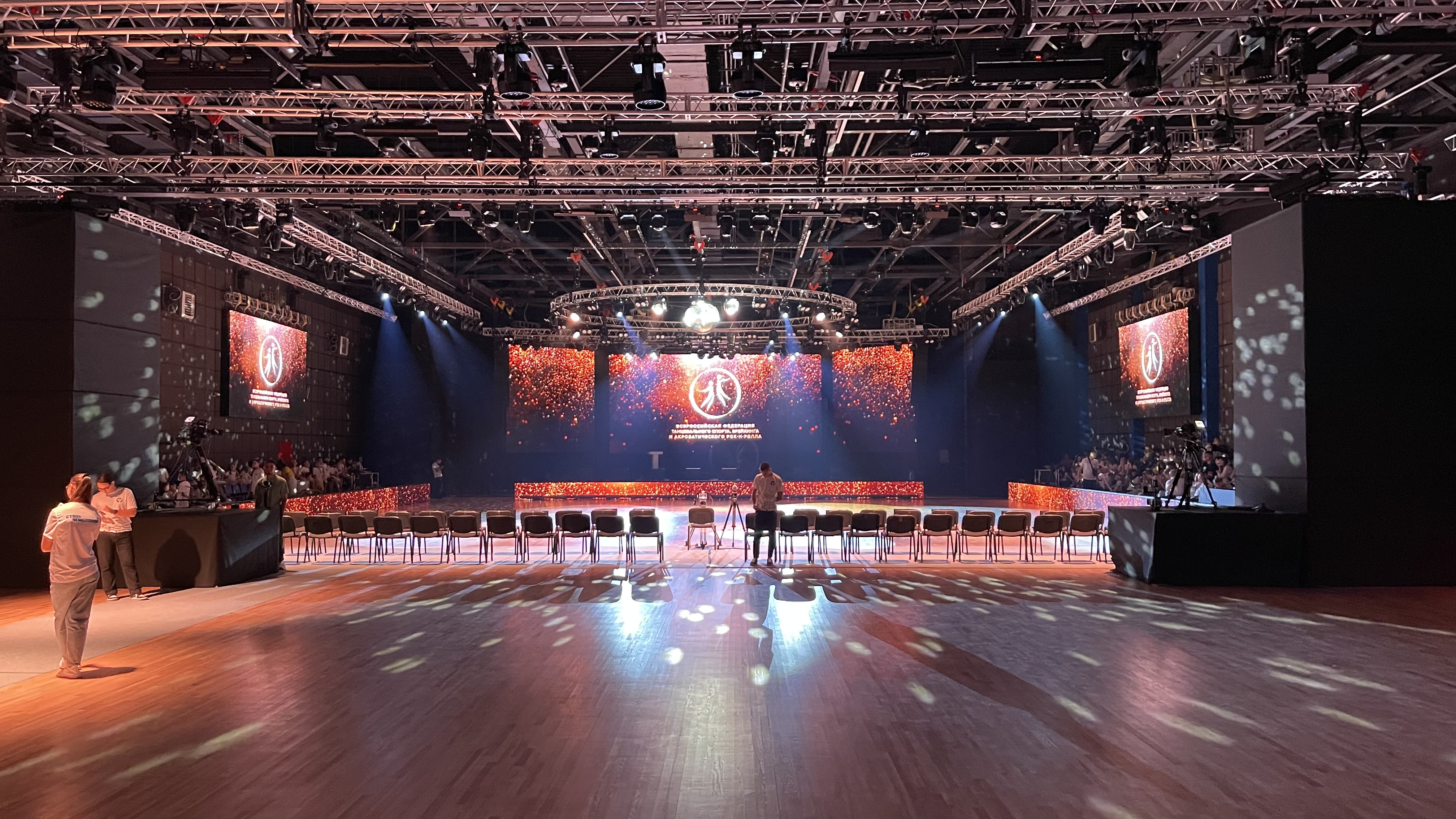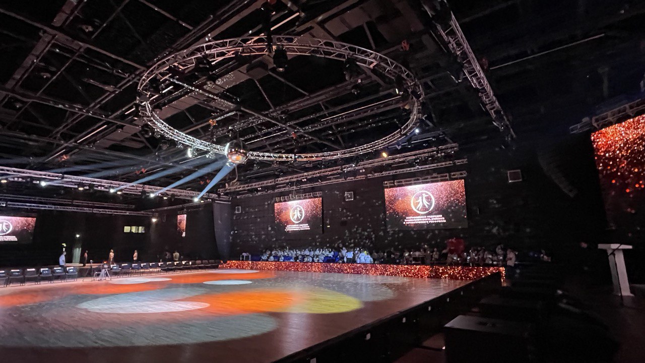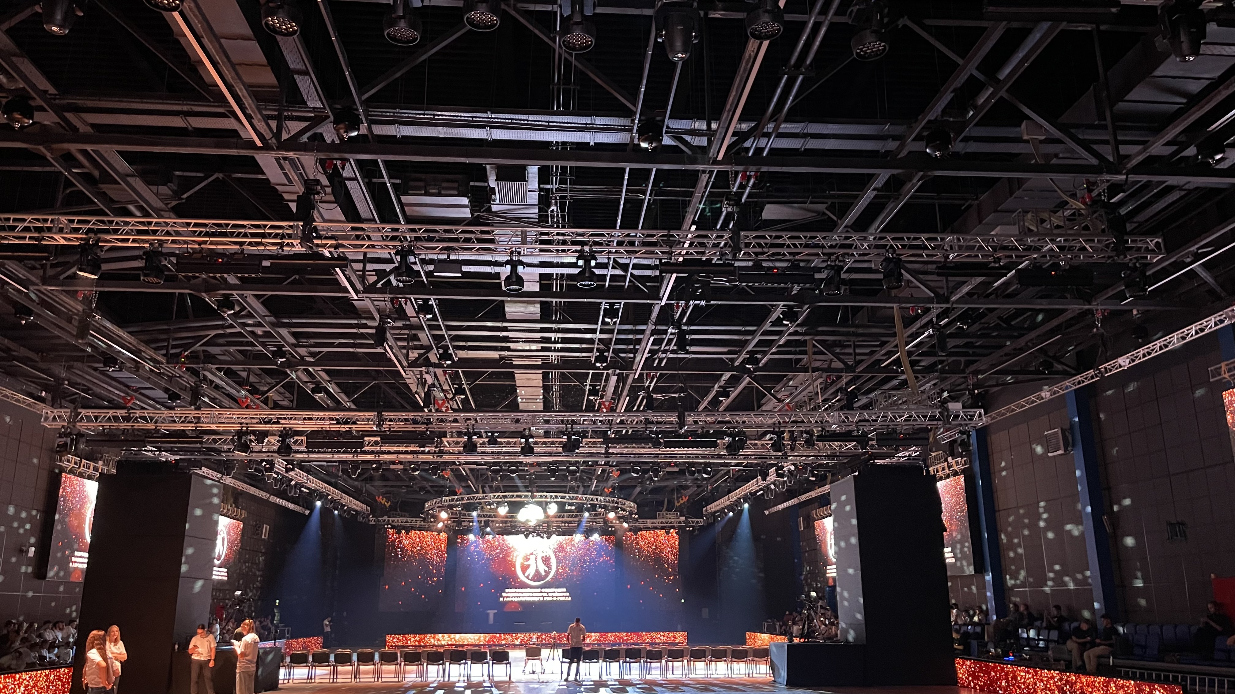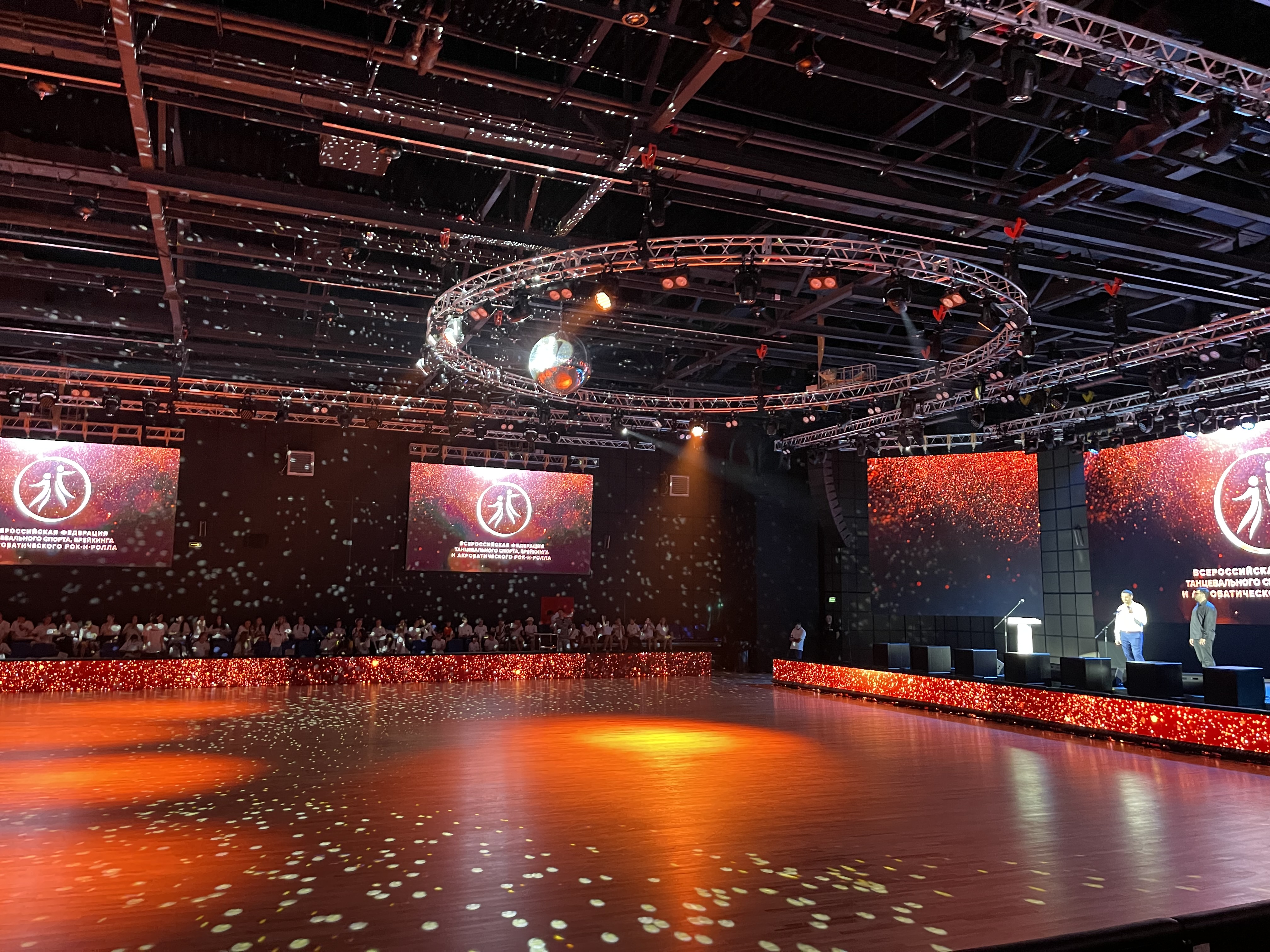 На четвертом этаже центра находится большой зал для проведения спортивно-танцевальных мероприятий, где нашли свое воплощение наши идеи. Мы запроектировали и установили здесь 240 световых приборов, 10 мультимедийных LED-экранов, 78 LED-бортов протяженностью 98 метров. Чтобы разместить их, потребовалось 372 метра алюминиевых ферм, 91 цепная лебедка, 872 метра кабелей электропитания и 688 метров кабелей системы управления. Все – в соответствии с нашим кредо «Эстетичный Монтаж». В центре зала смонтирована фермовая конструкция в виде круга диаметром 10 м.